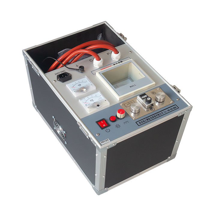 The equipment uses switching power supply to form a high-voltage constant current source, no-load voltage 15KV, short-circuit current 50mA, high-sensitivity amplifier and galvanometer to indicate balance, and proportional potentiometer to form a balance bridge, the whole is placed at high potential, the measurement cable is specially designed The double-core high-voltage rubber cable adopts the four-terminal resistance measurement method to avoid the error introduced by the lead resistance. The cable is reliably grounded through the braided shielding layer. The operation button on the panel is at a low potential, and the bridge is operated through an insulating rod. The high voltage constant current source and bridge are integrated in a portable aluminum alloy case. Therefore, the device has high voltage, light weight, convenient operation and safe use.